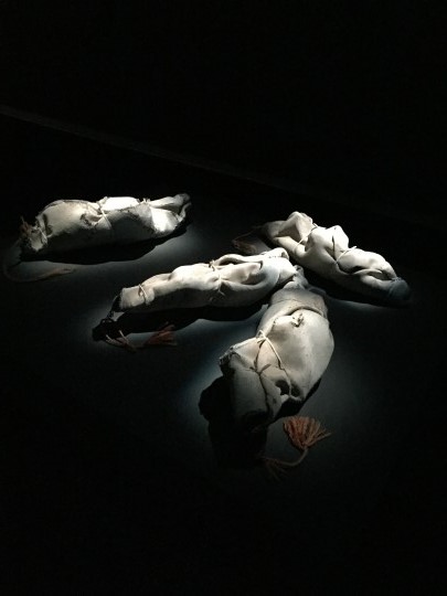 SALT Galata’daki Düşlerin Sonu’nda, Günday’ın bahsettiği, insanların hayatlarını mezhep, güç, petrol gibi sebeplerden mahveden o berbat kumaşların heykellerine bakıyormuş gibi hissettim. Heykelleri yapan sanatçı, Nikolaj Bendix Skyum Larsen de kumaşlardan yola çıkmış denebilir aslında. Başka işlerinde de mülteciler konusuna değinen Larsen; “Her gün boğulmuş mültecilerin fotoğraflarını görüyordum ve işimle bu konuya dokunmak istedim. Bu insanları bir bir eserle onurlandırarak onların unutulmamalarını sağlamak istedim,” diyor. Larsen, yan yana beyaz pamuk kumaşlara sarılmış mülteci cenazeleri olan bir fotoğraftan yola çıkarak 48 tane kumaşa sarılmış vücut görünümlü heykel tasarlamış. Sanatçı, ceset torbalarını andıran bu heykelleri, tüm yüzeyleri sualtı organizmalarıyla kaplanana kadar denizde bırakmayı, sonrasında da denizin bıraktığı izlerle bir enstalasyon olarak sergilemeyi amaçlayarak heykelleri Güney İtalya’nın Calabria bölgesindeki Pizzo Calabro liman kasabasında denize indirmiş.