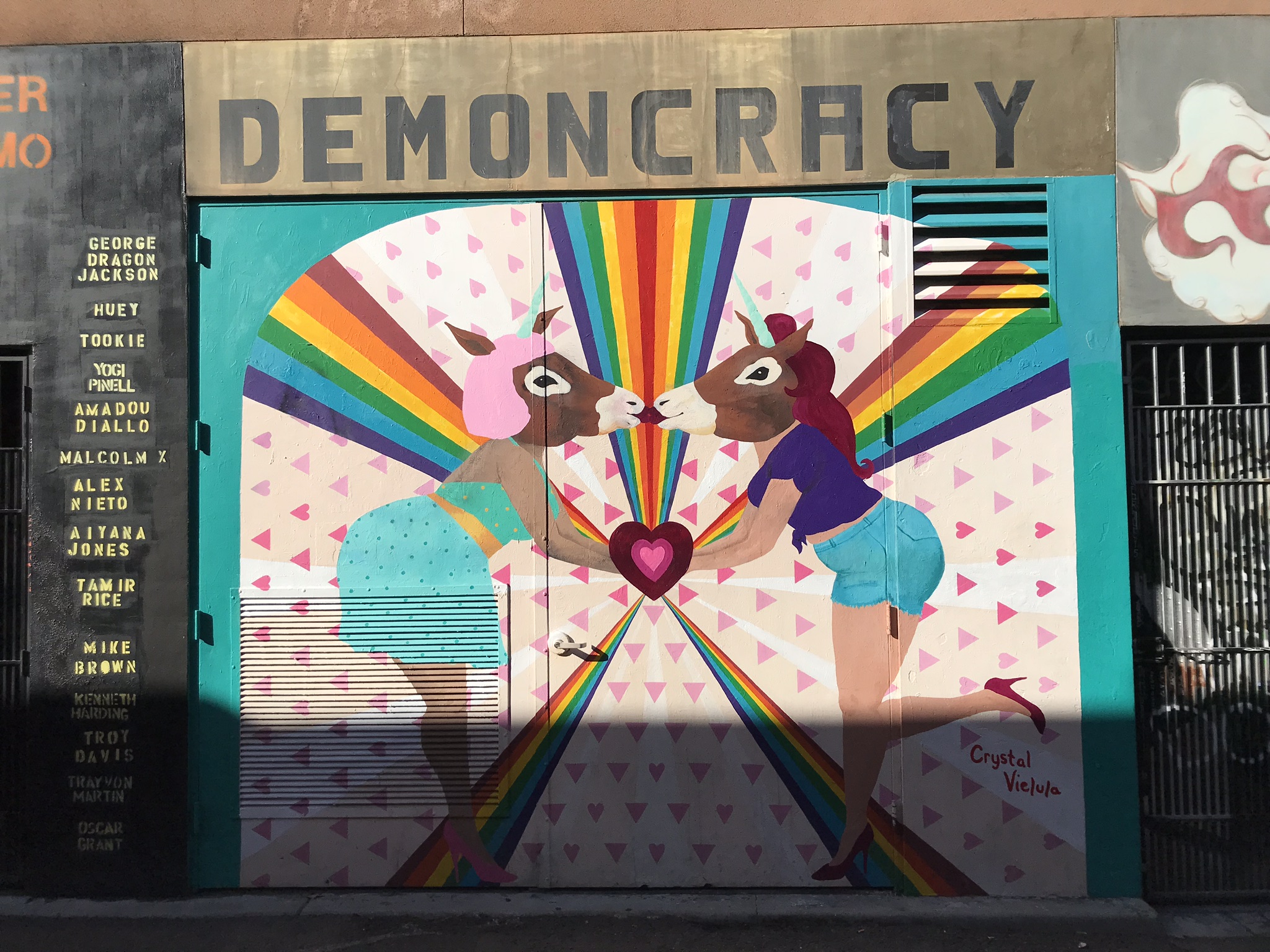 Women’s Building’i gördükten sonra, “Bu mahallede kesin başka hazineler var,” diyor ve eski dostunuz Google’a sarılıyorsunuz. O da sizi hayal kırıklığına uğratmayıp iki yanınızda uzun yollarda rengarenk görünüşlü, diğer yandan bol ağır politik mesajlı Clarion ve Balm pasajlarına (Alley) götürüyor. 1980’lerden bu yana insan hakları ile ilgili duvar resimlerinin yapıldığı bu pasajlarda resimler üzerinden polis şiddeti, centrifikasyon (sosyal mutenalaştırma diye geçiyor Türkçe’de bir diğer ismiyle), sosyal eşitsizlik sorgulanırken adaletsizliklere baş kaldırmış kahramanların resimleri de baş köşede yer alıyor.