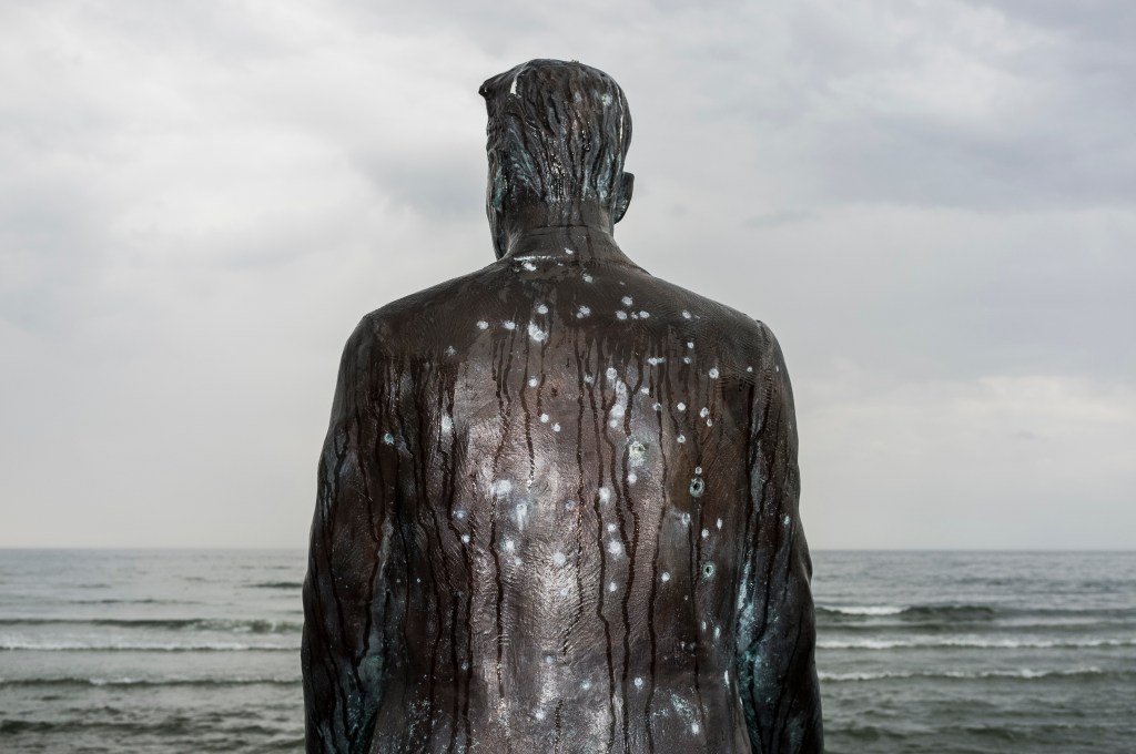 Uğur Çolak ve “Nazım”: Esin keçisi sergisini ilk duyduğumda aklıma gelen ilk fotoğraf Silivri kıyılarında bulunan Nazım Hikmet Ran heykelinin kurşunlanmış fotoğrafı oldu. Nazım Hikmetin Ran’ın hayatında karşı kıyının etkisi aslında bu fotoğrafta beni çeken durumdu. Disiplinler arası bir sergide hem heykel hem edebiyat hem de fotoğrafın tek bir işte buluşmuş olduğunu düşünüyorum. Silivri açıklarında bir gemide yargılanıp hüküm giyen Nazım Hikmet Ran yargılandığı sahile artık üstünde kurşun delikleri ile bakıyor.