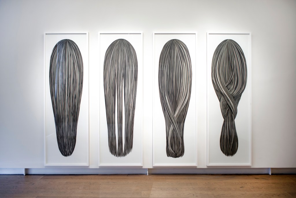 Ayça Telgeren’in “Tenden Daha Yakın” sergisine ayak bastığınız anda, kendinizi çok özel bir alanda buluyorsunuz duygusal anlamda. Saçlar, eller, bedenler; gözle herkesin görebildiği, ama sadece sevdiklerimizin temas edebildiği alanlar. Önce sizi saçlar karşılıyor: Açık, örgülü, yarı açık, el ile kesilip ince ince büyük tablolara yerleştirilen, kağıttan saçlar. Size arkası dönük o kişinin, bir nevi mahremi. Serginin kalbine doğru ilerledikçe, daha da özele, sanatçının kendi saçlarına varıyorsunuz. Saçlarını nakış gibi işlemiş Ayça Telgeren. Saç nakışıyla tutunca birbirini bırakmayan eller yaratmış. Bu eller çoğalıp serginin bir duvarında hep yanınızda, bazen ilgisinden, sorgusundan usanıp kaçtığınız, ama sonra hep dönüp tuttuğunuz ailenizin ellerine dönüyor. Sanatçı, aile fotoğraflarından yola çıkarak tasarlamış aile elleri kesimlerini.