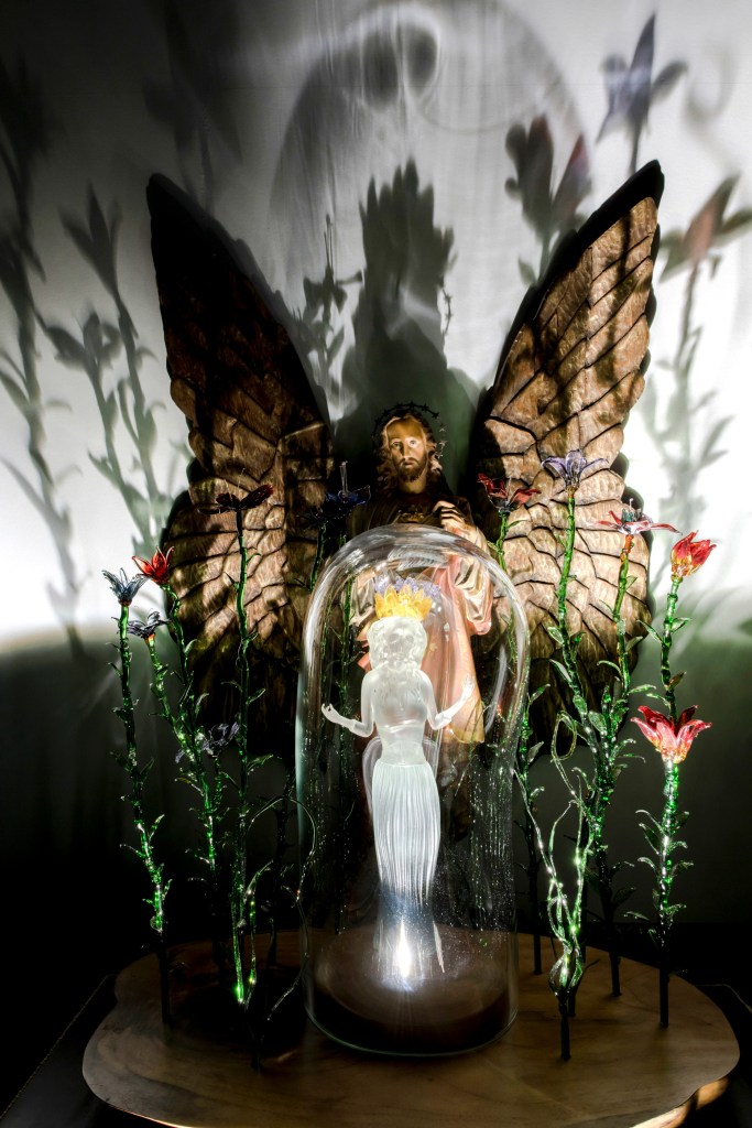 Sonra Introvert sergisinden bahsediyoruz. Resimden farklı alanlara kaydığı, çizimlerini farklı malzemeler ve genç sanatçılarla yeniden yorumladığı bir sergiydi. Yolculuğuna devam ederken, bu yeni sergide, Introvert sergisinin üzerine yeni malzemeler ve yeni deneyimler eklemiş sanatçı. Özellikle üç boyutlu işlerin kendisine çok heyecan verdiğini ve bu heyecanla daha da çok ürettiğini anlatıyor… Sanatçının çizimlerini farklı malzemelere 32 kişilik, genç sanatçılardan oluşan bir ekip taşımış; her genç sanatçı kendi çalıştığı malzeme ile çizimleri üç boyutlu heykellere çevirmiş. Bir önceki sergisinde kullandığı seramikler, nakışlar, eskiciden bulunan malzemelerle heykeller, polyester cam heykeller, narin cam üflemelerin yanı sıra, bu sergide mermer, keçe, ayna ve hazır malzemelerden kolajlar da eklemiş, ilk kez bir mobilya yapmış. Eserlerin yanında görünce pek şaşırdığım (Instagram’dan görüyordum ama bu kadar büyük ve kapsamlı olduğunu hayal edememiştim) bir de sınırlı üretim baskıların, keçelerin, sanatçı defter kopyalarının hatta ayakkabı, küpe gibi giysi ve aksesuarların olduğu bir Art Shop da var. Yepyeni ve bence pek hoş bir girişimle Anna Laudel’in zaten var olan küçük dükkanı tamamen bu sergiye özel olan yeni bir dükkan haline gelmiş.