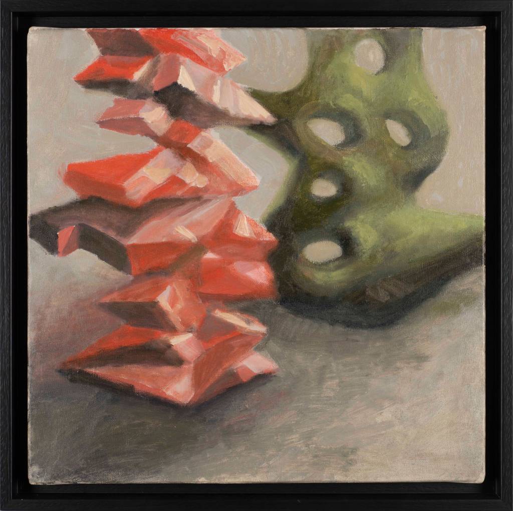 Sanatçı, bu ikilem ile “nesneler, onu oluşturan görüntülerden aslında daha büyük/geniş, bizim algımız sınırlı” mesajını vererek bizi dünyanın hayal edilemeyecek genişliği üzerine düşünmeye sevk ediyor. Bora Başkan, algıları sorgularken, bu algılara yol açan araçlara da dikkat çekiyor. Geçen hafta Maurizio Cattelan’ın ünlü muzundan yola çıkarak kavramsal sanat eserlerinin sergilenmesi üzerine Graham Bowley’nin New York Times için kaleme aldığı çok eğlenceli bulduğum It’s a Banana. It’s Art. And Now It’s the Guggenheim’s Problem. yazısında, Bowley, Yoko Ono’nun1966 tarihli bir kaideye oturtulmuş tek bir elmadan oluşan işi Apple (Elma), ya da Darren Bader’in Whitney Müzesi’ndeki sergisinde meyve ve sebzeleri heykel olarak “yeniden tasavvur ederek” bildiğin meyve sebzeyi kaideye oturtarak sergilediği işlerinden bahsediyordu. Kaide olmadığında “işler” birer sıradan günlük objeydi. Bora Başkan da sergisinde algı dünyasını sorgularken kaidelere değiniyor. Bir sanat eserini eser yapan, aydınlatma, renk, konumlama, kaideler; tuvallerde kendine yer buluyor. Belki de ilk kez renk kullanımı da bu yüzden. Bütün bu nesnelerin, araçların toplamı mı cismi eser yapıyor? Nesne, kendi alanını böyle mi yaratıyor?