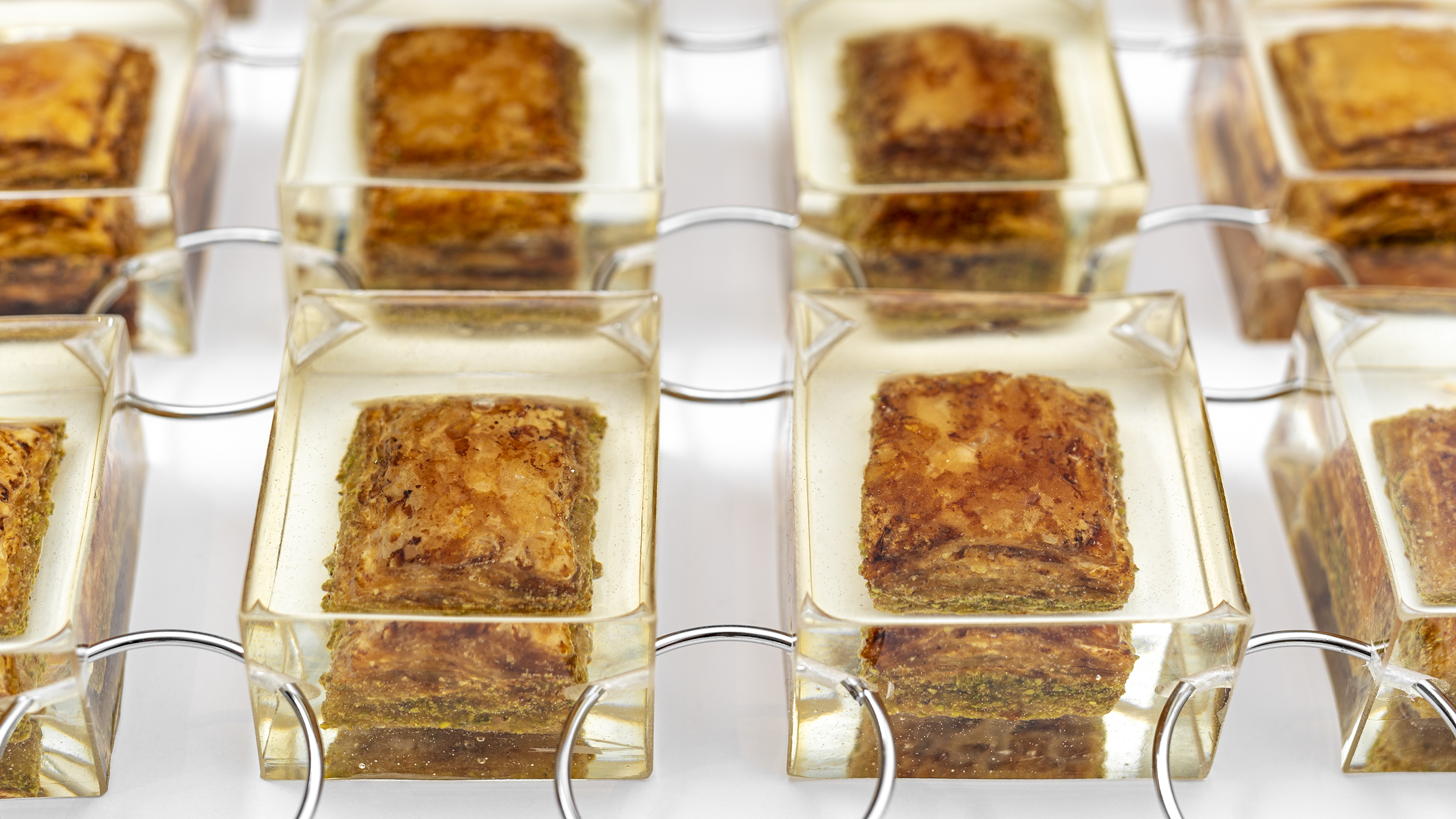 Tarihin görünmeyen kısmı olan kadınlar için Gelecek Tezgahları kurmuş Sütunç. Hani tek yapabildiği örmek olarak kodlanmış, biz “ören bayanlar” için. Ören bayan, yine örmüş bakarsan. Bu kez teknolojiyle. Baklava desenli klasik bir dokuma tezgahı kurayım demiş Eda; bir halı yapayım… Ama işte, hayaller, kurgular, akıllar, kaplara sığmasın, halı uçsun. Baklava motifi yerine gerçek baklavanın, bir gıdanın, nasıl epoksiye dökülüp halının motifleri haline gelmesini araştırayım. Halıma motor takayım, halımı tavana asayım, halımın mekaniği çalışsın diye programlayayım. Şekerleriyle yapışan, katman katman içimize işlemiş baklava, iki eşkenar üçgenden oluşuyor. Benim geleceğim de eşkenar, eşit olur mu? Yeni dokumamla daha eşit bir geleceğe uçar mıyım?