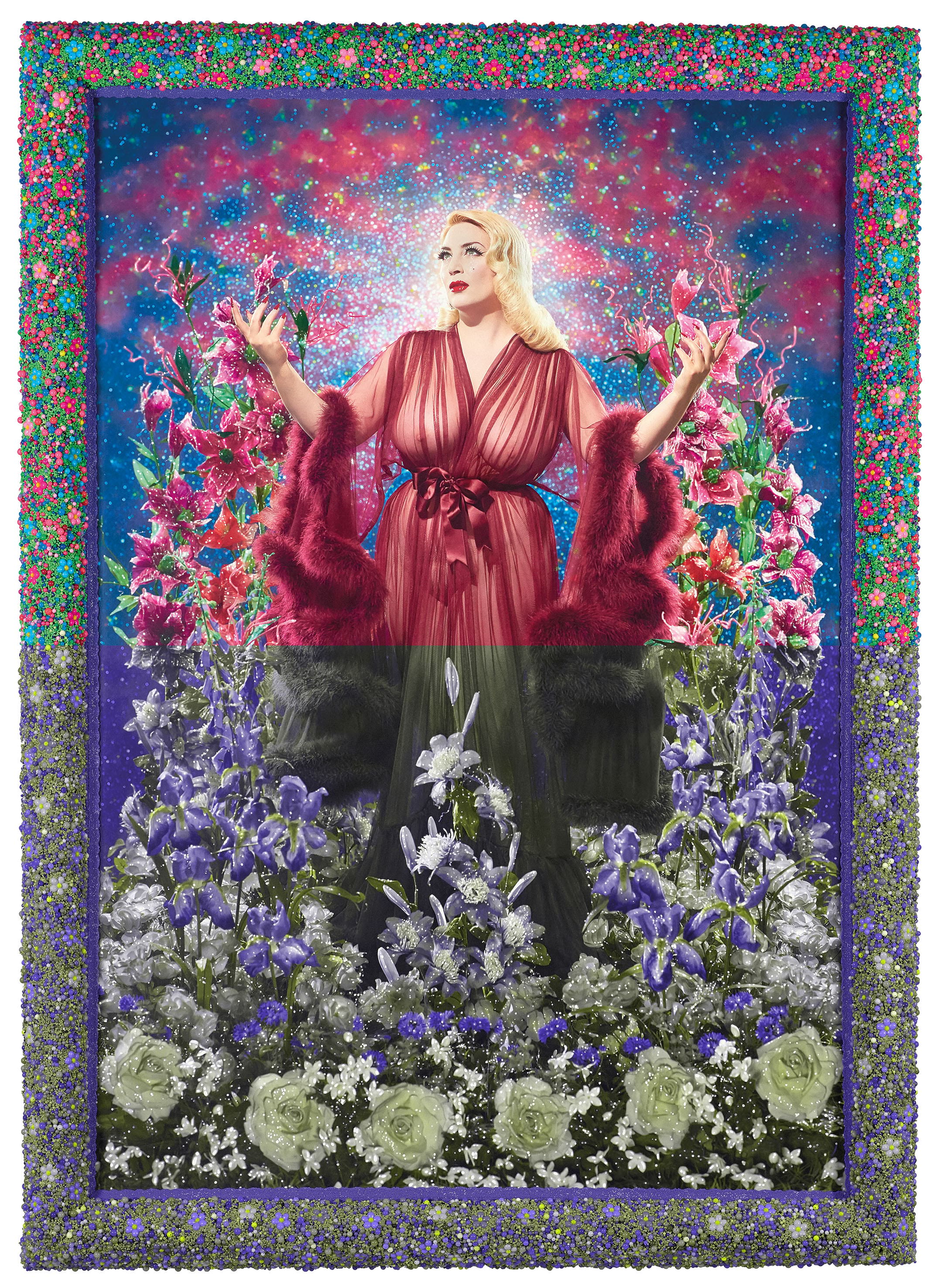 Pera Müzesi’nin yeni açılan sergisinin kapısından içeri giriyorum ve sanki sorumluluklarımdan ve içinde bulunduğum ciddi dünyadan ana kaçış alanım RuPaul’s Drag Race’te (10 seneden fazladır yayında olan, drag queenlerin yarıştığı bir realite şovu) bulunabilecek resimlerden biri karşılıyor beni. O pespembe, pasparlak, abartılı makyajlı stüdyoya yakışacak bir iş. Oh be, açık açık avamlık(?)! Showgirl Lolly Wish, parlak mor ve pembe çiçeklerin arasında, başında hare gibi bir parlaklıkla, ellerini kaldırmış, bir tanrıça gibi poz veriyor müzede önümüzde asılı olan fotoğrafta. Çerçevesi de rengarenk şeker ve boncuklardan. Pierre et Gilles, bir stüdyoda çekmişler bu resmi. Resmi o kadar büyük ve ilgi çekici ki, adeta Lolly içinden “Bana bak!” diye bağırıyor. Hoş mu şimdi bu kadar ilgi çekmeye çalışmak? Basitlik değil mi?
