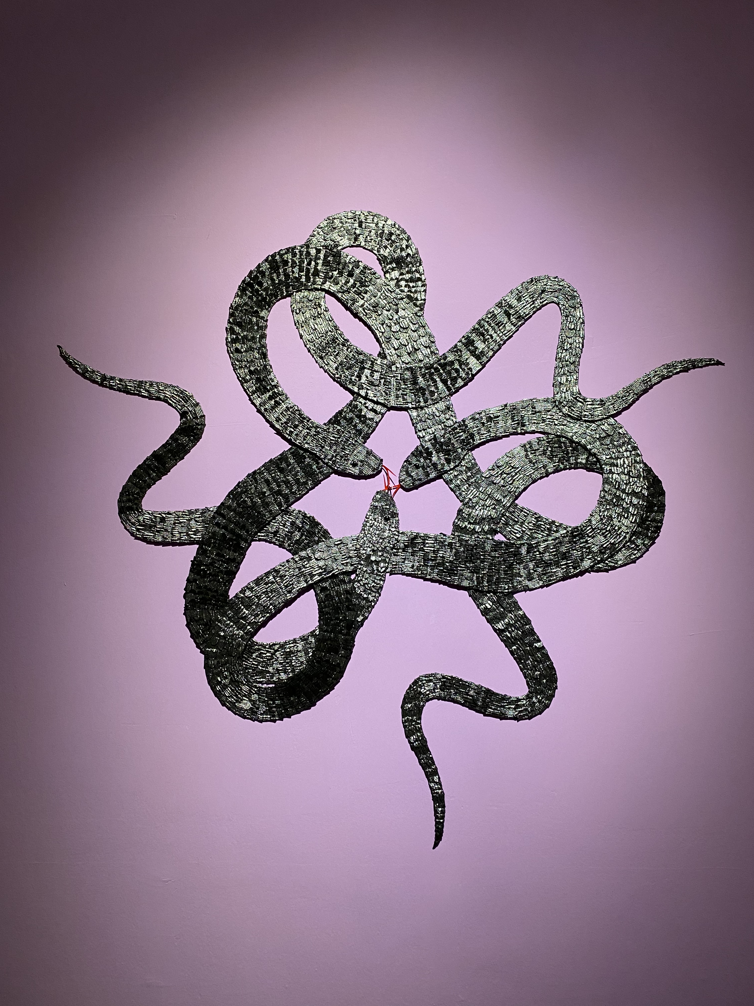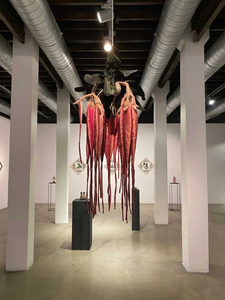 Bütün sergi, işte böyle aşkın, erotizmin, bedenlerin doğaya taşma halimizi resmediyor, cismediyor. Oturup araştırmak için kendime not aldığım, Annie Sprinkle ve Beth Stephens’ın ortaya attığı “ekoseksüel” yaklaşım üzerine kurguluyor sergisini Şafak Şule Kemancı. İnsanın kendini, cinselliğini kabul ettiği ve doğayla bütünleştiği hayali bir bahçe kuruyor. Renklerin, zevklerin serbest olduğu, yepyeni bitkilerin, ağaçların bu dünyayla uyumlu olduğu bir harikalar diyarı. Bahçeye girerken insanevladını günaha davet ettiği söylenen birbirlerine sarılmış parlak yılanlar karşılıyor sizi. Halbuki yılan benim için sonsuzluk, bilgelik demek… Doğru bir yere girdiğimi düşünüyorum. Ana sergi salonuna adımınızı attığınızda o güzel, özgür dünyanın içine giriyorsunuz Alice’in harikalar diyarına adım attığı gibi… Daha önce hiç görmediğimiz, renklerine, formlarına hayran olduğum, fanuslar içinde polimer kilden yarı insan yarı bitki, capcanlı renkli heykeller, mekanın ortasında tavandan sarkan, kenarlara bütün haşmetleriyle yayılmış lateks, saten ve kadifeden yapılmış dev endemik bitkiler, cam altı tekniğiyle boyanmış bize doğru parlayan tırnakları izliyorsunuz. Bastırılması gerektiği düşünülen, hor görülen efemine (ayol) simli tırnakların ve hep heteroseksüel erkeklerin istek ve fantezilerine odaklanmış bu dünyada kimsenin pek de ne olduğunu, ihtiyaçlarını sorgulamadığı kadın cinselliğine ait çizimlerin özellikle doğuya, geleneğe ait cam altı boyama ile yapılmış olması çok güzel bir manifesto diye düşünüyorum. Geçmiş, gelecek, gelenek, gerçek aslında hepsi birbiriyle iç içe geçmiş durumda, yaşamlar gizlice sürer, biz konuşmaktan sakınırken, aslında hiçbir şey yok olmuyor. Hepsi gelip bu hayali ama en gerçekçi ormanda yepyeni vücutlar bulmuş işte.