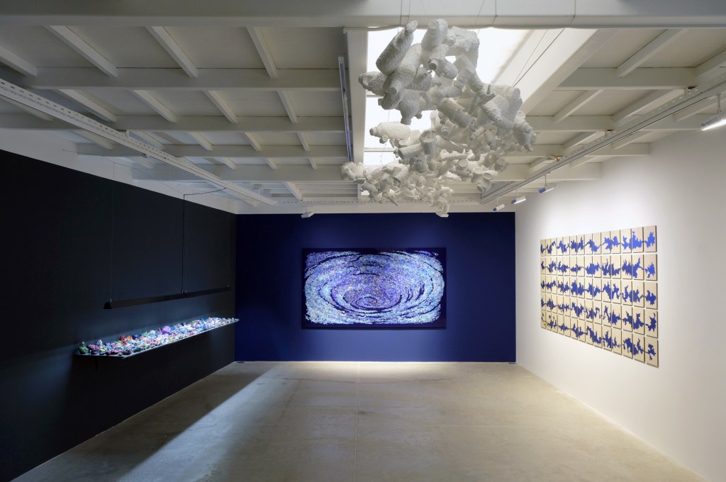 Kafamızı çevirdiğimizde, serginin en çarpıcı eserini, hayatımızdaki tüm materyalleri içeren girdabı görüyoruz. Sanatçı sözlükle çalışarak günlük hayatta kullandığımız 6000 nesneyi tespit etmiş, hepsinin tek tek görselini bulmuş, maviye boyamış, kesmiş, biçimlendirmiş ve bu materyal girdabına katmış. Yaklaşık 4 senede oluşmuş bu girdap. Sergi fikrinin doğuşundan bile önce, okyanuslarda oluşan çöp adaları gibi, boşluğun içinde bir eser oluşmuş. Denizle serüvenimizi, kağıttan yapılmış bir heykele yazılmış yaşlı denizcinin hikayesi ile sonlandırıyoruz. Albatrosu vuran denizci, ancak kafasını kaldırıp özür dilediğinde, hayata gerçekten sevgiyle yaklaştığında evren onu bağışlıyor ve onun üzerine yağan mucize gibi, bizim üzerimize de kozmik toz yağıyor sergi haritasının son kısmına gelip kafamızı kaldırdığımızda. Bahsettiğim atık şişelerden, kozmetik çöplerden, kozmik toz yağdığını hayal ediyor Ilgın Seymen. Dünyaya her yıl 60 ton uzay tozu iniyor, diyor. İçerisinde atıkların da bulunduğu bu tozla planktonlar çoğalıyor, bitkiler klorofil üretiyor, canlı ve cansızın varoluşu, ikiliği, birbirini mümkün kılıyor.
