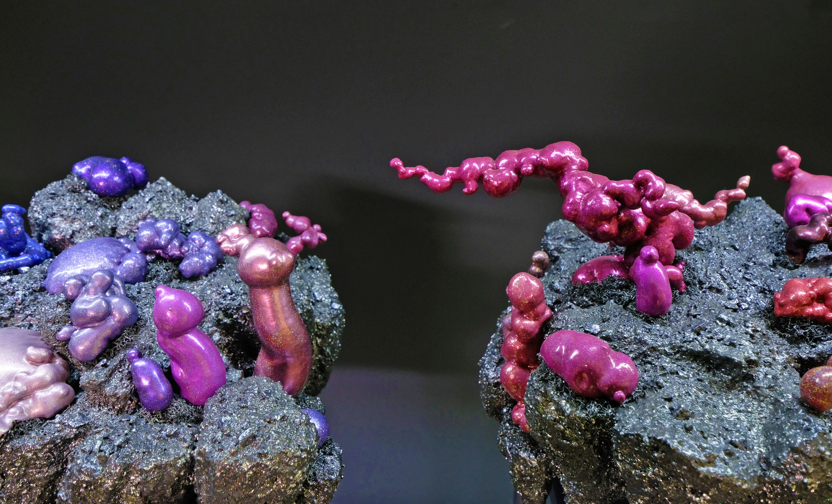 Devam ederken, gözümüzü alan ışıltıları ve haritayı takip ederek toprağa ulaşıyoruz. Sanatçının topladığı asfalt, moloz çakıl, kayaçlar birbiri ile eşleşiyor. Hepsi bir çift halidnde. Bu bir aşk hikayesi değil, bir alaka göstergesi. Canlı ile cansız bir arada bulunuyor, birlikte parlıyor. Hemen yanıbaşlarında poliüretanlardan oluşmuş bir orman var. Cansız olabilirer, atık olabilirler ama yanı onlar gibi bizler de reaksiyona uğradıktan sonra bugünkü halimizi, formumuzu buluyoruz diyor Ilgın Seymen. Poliüretan heykelcikleri yapmak için kullandığı şişeler, galerinin tavanını kaplayan bir heykele dönüşüyor.