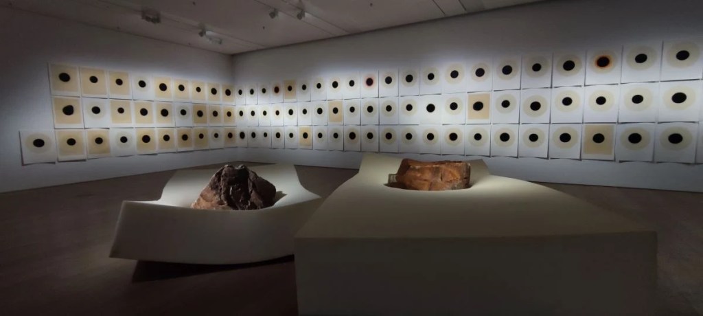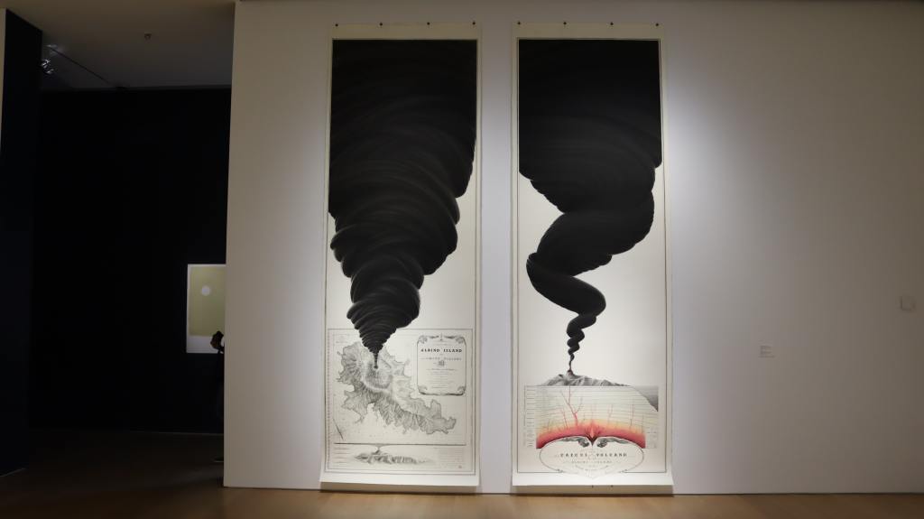 Karanlıktan çıkıyor bu sergi. Kara delikler, volkanların kara dumanları, kara taşlar, kara enerjiler… Arter’in güneş almayan, karanlık bir katında çıkıyorsunuz bu yolculuğa. Önce bir video karşılıyor sizi. Sanatçının 2020-2022 yılları arasında ürettiği eserlerin en yenisi, bildiğim kadarıyla ilk ve sergiyi en etkileyici kılan eserlerden, bir video denemesi. Zephyr I. Yunan mitolojisinin dört rüzgarından biri. Kocaman bir ekranda, üzerinde hiçbir gücünüz olmadığı büyük bir doğa olayı izliyorsunuz. Sanki kara bir hortum süzülüyor. Agresif değil, kendi akışında. Korkunç değil, güzel. Sanatçı bu videoyu bir miktar mürekkebin büyük bir bardak suda hareketini kaydedip ölçeklerini değiştirerek ortaya çıkarmış. Algılarımızda yaşananlara örnek, güzel bir ironi diye düşünüyorum. Büyük algıladığımız şeyler (mesela insanlık olarak bizzat kendimiz) küçükken, küçük gördüğümüz şeyler bizden çok daha büyük.