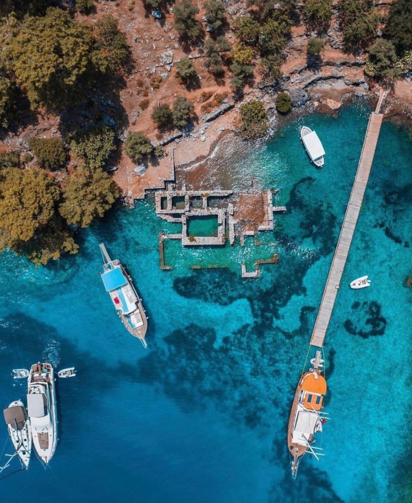 Bu kısacık bilgilere de hakim olduktan sona hayatı, hayalleri bekletmeyeyim, bir yerden bugün başlayayım diye bir koy seçip onun hikayesine yoğunlaşayım dedim. İki koya gözümü diktim. Bunlardan biri, ünlü mavi turlardan birinde, 1974 yılında Bedri Rahmi Eyüboğlu’nun bir kayaya içine 6 farklı hayvanı yerleştirdiği koca bir balık resmi çizdiği ilk adı Taşkaya olan, artık herkesin Bedri Rahmi Koyu olarak anılan koy oldu. Koya yaklaştığınızda tepedeki kral mezarları, bilmediğiniz mistik hikayeleri hatırlatıyor size tepeden bakarak… Diğeri de hakikaten masalsı bir güzelliği olan Batık Hamam Koyu’ydu. Koyda batık bir tarihi hamamın kalıntılarının yanı sıra, sular altında kalmış bir Bizans manastırının kalıntıları da bulunuyor. Koya Kleopatra Koyu da deniyor ve bu koyda yüzenin 10 yıl gençleşeceği, güzelleşeceği söyleniyor. (Henüz 6 ay bile genç gözükmüyorum, beklemedeyim…) Koyun tarihi ile ilgili çeşit çeşit rivayet var; bunlardan en akla yatanı koyun suyunun volkanik sıcak su kaynağı sebebiyle cilde iyi gelmesi. Bir rivayete göre Kleopatra burada yüzmüş, diğerine göre bir gezi sırasında hamam ona armağan edilmiş, bir diğerine göre ise koyun Kleopatra ile hiç alakası yok, sadece hem kendi hem suyu güzel olduğu için Kleopatra diye anılmış. Koyların hikayelerini araştırayım dedim ama arayıp tarayıp internette ancak böyle birer paragraflık magazinsel kaynaklar bulabildim. İngilizce yayın da bulamadım maalesef. Demek ki hakikaten tarihlerin araştırılıp herkesin ulaşabileceği bir halde yayınlanması şart! Beni fonlamak isteyen varsa hazırım!