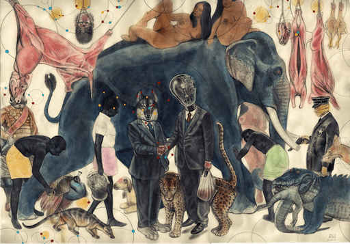Burak Dak’ın eserlerini ilk kez yine aynı galerideki Kesişme VI sergisinde görmüş ve eserlerin hikayelerini bir define avı yapıyor gibi zevkle dinlemiştim. Çünkü Dak’ın resimlerinde ilk anda gözünüze çarpmayan herhangi bir materyalin, arka fondan bakan bir insanın da o resmin hikayesinde, anlatmak istediklerinde bir yeri oluyor. Sanat tarihi, dünya tarihi, mitoloji, doğal yaşam tarihi, tek tanrılı dinler, güncel olaylar ansiklopedisever Burak Dak’ın resimlerinde yer buluyor ve resimler aslında bugünü anlatıyor. Yaşadıklarımız, tarihin farklı alanları ve dönemlerinden karakter ve objelerin bir çizimde birleşmesiyle bize o kağıt üzerinden gizli gizli geri dönüyorlar.