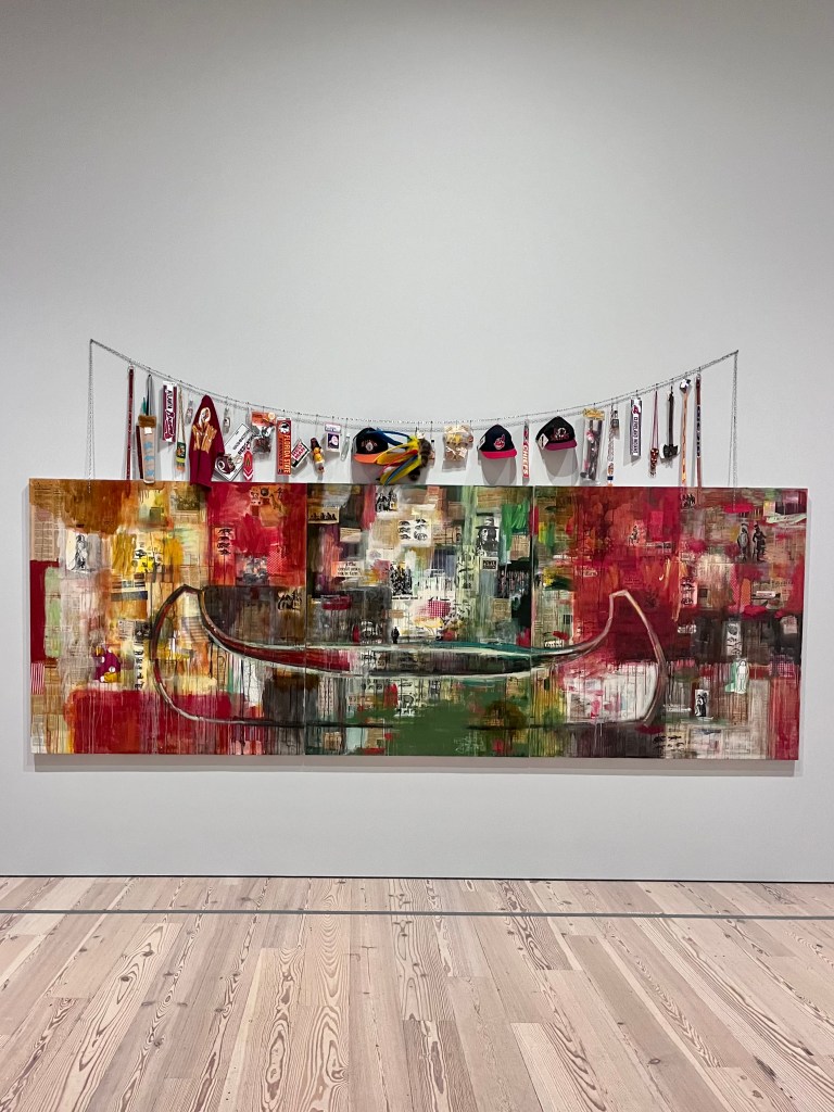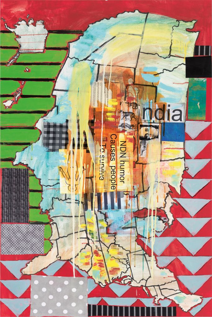Smith, kişisel ve kolektif anıları, haritalama, tarih ve çevrecilik fikirlerini konuşlandırıyor ve yeniden sahipleniyor. “Ben, biz buradayız,” diyor. Smith, eserlerinde geleneksel Kızılderili sembolizmi ile çağdaş sanatsal tekniklerin harmanlıyor. Sıkça kroki çizimleri, geleneksel desenler ve kültürel göndermeler gibi unsurları tablolarında ve karma sanat eserlerinde kullanyor. Eserlerinin başka bir ayırt edici özelliği ise, sanatçının ucuz nesneler ile yaptığı kolajlar. Geçen haftalarda Afrikalı-Amerikalı aktivist sanatçı Betye Saar’ı yazmış ve nasıl ucuz popüler objeleri kullanarak eleştiri yaptığını anlatmıştım. Smith de spor maskotları, sahte tüy başlıklar ve plastik Kızılderili baltaları gibi ucuz, toplu üretilen çocuk oyuncaklarını kullanıyor sanatında. Saar’dan biraz daha farklı olarak geniş bir ucuz ürün yelpazesi değil, kendi kültürünün ABD tarafından karikatürize ve popülerize edilmiş, içi boşaltılmış öğelerini kullanıyor. Tüketimin çılgınca yaşandığı bir ülkede, günlük ve değersiz objeleri sanatlarının bir parçası yapıp insanlara durup baktırıyorlar politik mesajlarla. Bir nevi değersiz olan diğer bir yandan da tüketilmeye bayılınan “sıradan”ı daha derin politik mesajlara ilgiyi çekmek için kullanıyor iki kadın sanatçı da.