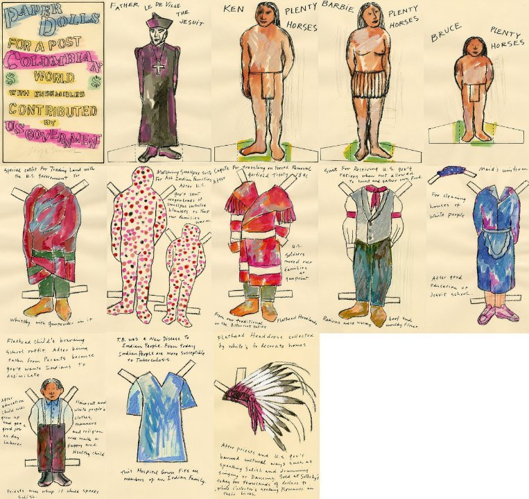 Smith’in eserlerinin görsel etkileyiciği, renklerinin çarpıcılığının (ki renk tonları seçimi de ayrı bir yazı konusu) yanısıra ABD-Kızılderili ilişkileri için bir tarih dersi. Buna bir örnek olarak bir serisinden bahsedeceğim. Kağıt Bebek serisi, (bu serinin bugünü kasıp kavuran Barbie pazarlamasından çok önce yapıldığını ne olur ne olmaz not düşelim) sanatçının kendi aile geçmişinden doğuyor. “(Krisof) Kolomb Sonrası Dünya İçin Kağıt Bebekler” adlı eserde, kıtaya yeni gelen istilacıların Kızılderilileri maruz bıraktıkları işler, onlara biçilen roller görülüyor. İronik bir şekilde mavi, pembe ve sarının neşeli suluboya tonlarında boyanan ve başlarında bir Cizvit rahibi bulunan yerli bir aileyi sembolize eden kağıt bebekler, Barbie ve Ken isimlerini alarak kapitalist dünyaya gönderme yapıyorlar. Peki beyazların ve yerlilerin yer aldığı bu dünyada bebeklerle kim oynayacak, kim çalışacak? Yassı kafalı çocuğun yatılı okul kıyafeti, yerli halkın zorunlu askerlik öyküsünü anlatıyor. “İyi” batılılar, yerlileri gündelik işlere uygun görüyorlar, çıplak Kızılderili Barbie bebeğe hizmetçi üniforması giydiriliyor. Aynı resimde zulüm edilen Kızılderilerin geleneksel başlığı, bu “aksesuarı” hoş bir dekorasyon olarak gören beyazlara bahşediliyor. Bu ve bunun gibi birçok tarihi sembol barındıran, anlaşmalara, savaşlara gönderme yapan resim, meraklısına tek bakışta detaylı bir tarih dersi veriyor. Çok başarılı bir müze olduğunu düşündüğüm Whitney Museum’un Smith’in sergisine özel hazırladığı sayfada sergiden seçilmiş 10 adet esere tıklayarak eserlerin mesajlarını ve tarihsel referanslarını okuyabilirsiniz.