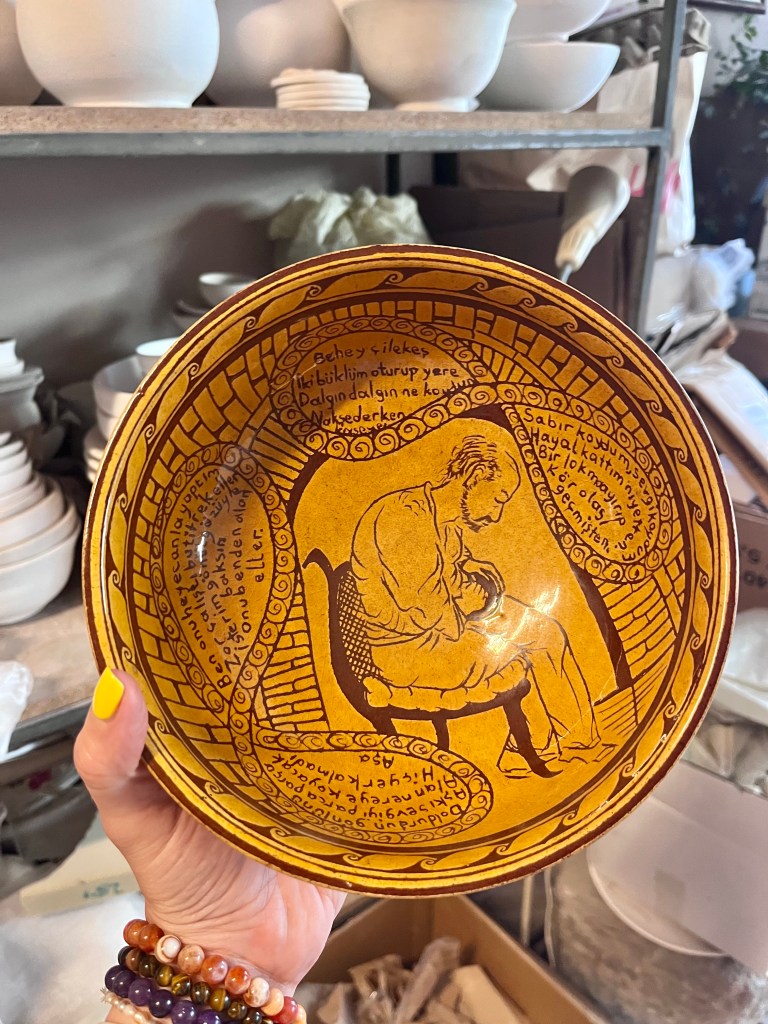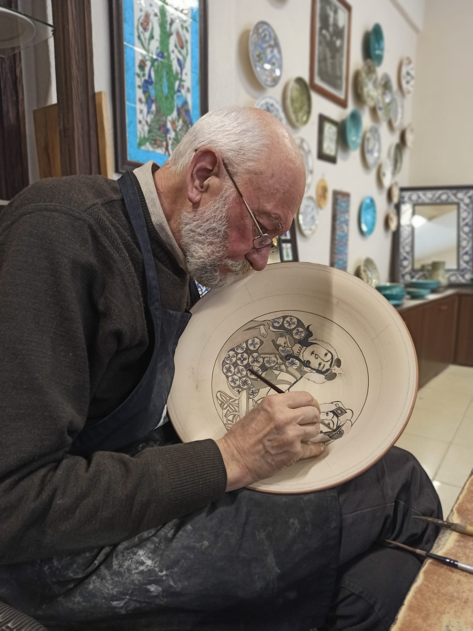 Bu güzel ailenin atölyesinde sohbet ederken çalışma alanlarına da girip çinilerin yapım aşamasına, o an çalıştıkları işlere bakmak istedim. İki tabak özellikle gözüme çarptı; biri Adil Can Güven’in 16. yüzyıldan bugüne farklı dönem ve devletlerdeki çini ustalara tabağa çizdiği işi, diğeri de ortaya kendini çizip yanlarına şiir yazdığı işi. İkisi de hakikaten muazzam, benzersiz, sanatçının tüm kimliğini döktüğü müzelik parçalar. Böylece Adil Can Bey’in şair yönünü de keşfettik derken, Nursan Hanım, eşinin kendi gönlünü yine bir şiirle aldığını anlattı da Adil Can Bey’e o çok hoş şiiri okuttuk. Hem gözümüz gönlümüz, ruhumuz doydu, hem çok şey öğrendik, hem Rahmi Koç’un koleksiyonuna kattığı bir sanatçının işlerinden aldık (ay Rahmi Koç muyuz neyiz?!) hem de harika bir aşk hikayesi dinledik! Daha ne! İznik, İstanbul’dan 1-1,5 saat. O yollar düşsün bu güzel şehre, bu yaşayan efsane usta ve ailesinin Adil Can Nursan Sanat Atölyesi’ne!
