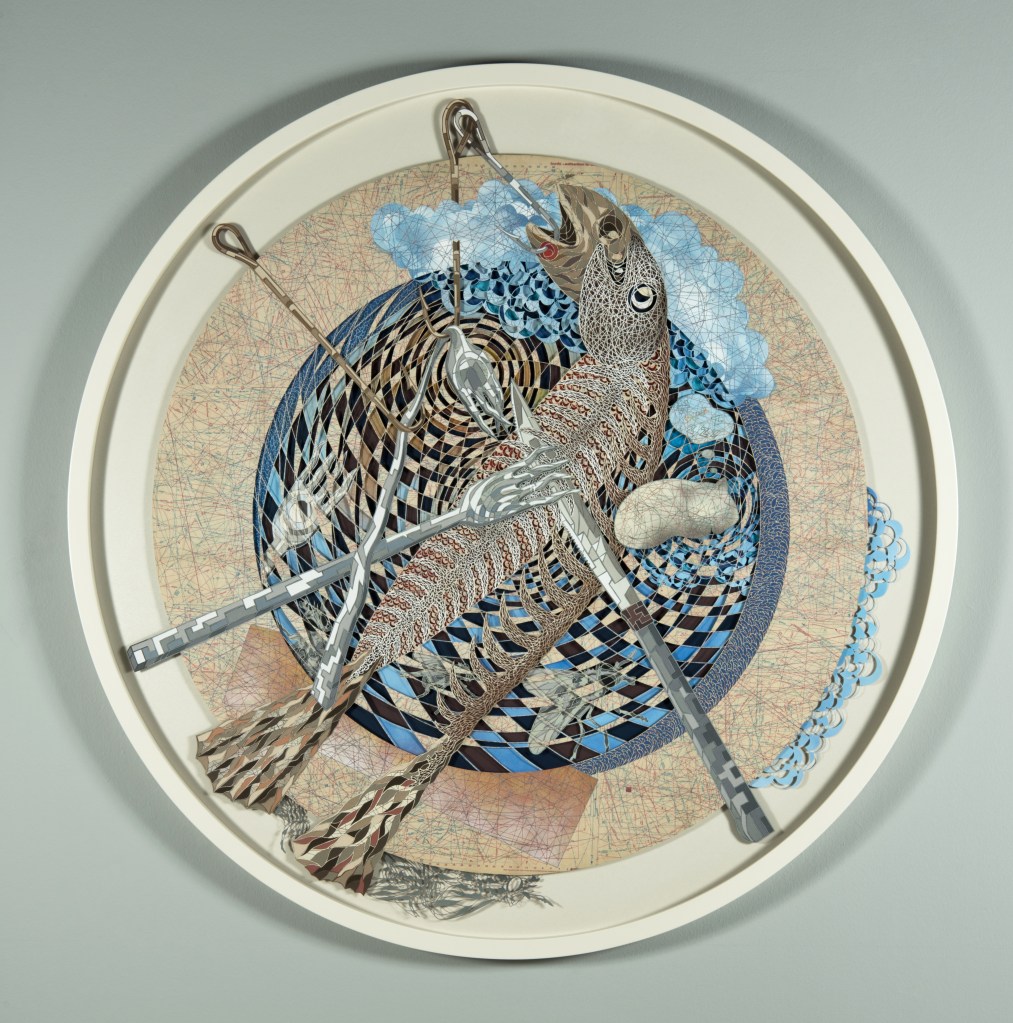 İlerleme-gerileme halindeyiz, diyor, sanatçı; sineklerin üşüştüğü, gökkuşaklarının büzüştürüldüğü ortamda hala nefes aldığını zanneden bir balığa benzetiyor bizi… Sergide bulunan balık heykeli de ilerleye gerileye çıkmış ortaya. Yüksel 2001’de heykel bölümünde öğrenciyken abisine akvaryumuna koyması için bir balık kılçığı heykeli yapmış. Heykel hakikaten de 4 sene akvaryumda durduktan sonra, sanatçı yeni bir fikirle heykeli geri almış ve üzerine bir çubuk eklemiş. Yakalanmış bir balık kılçığı heykeli ortaya çıkmış doğanın durumuna işaret etmek için. Yakaladık ama balık ölü… Sonraki dönemde metal çubuğu bükmüş, en son 2021’de bir mantar eklemiş üzerine. Sanki balığı (bizi) üstten tutan birşey var gibi, boyumuzu geçen bir mantara kafamızı kaldırıp bakıyoruz sergide. Denizin dibinde o balık kılçığı ile bir ileri bir geri gidip geliyoruz… Heykelin karşısında bize bir balık resmi ikram ediliyor: “Küçük Porsiyon”. Dünyada giderek daha büyük bir sorun haline gelecek olan gıda sıkıntısı, bizzat yaşadığımız ekonomik daralma, kendimizi kandırma halimiz. Tabakta üç çatal var, bir balık kılçığı, yarısı yenmiş yarısı yenmemiş bir başka balık ve üşüşmüş sinekler… Sebep-sonuç ilişkisi yaratamamış insanlar, söylemlere ve doyduklarına inanmaya çalışıyorlar. Kancaların çektiği (hala denizde miyiz ki?) bükülen çatallar sürreal bir hava yaratıyor. Bu tatsız bir rüya olmalı…