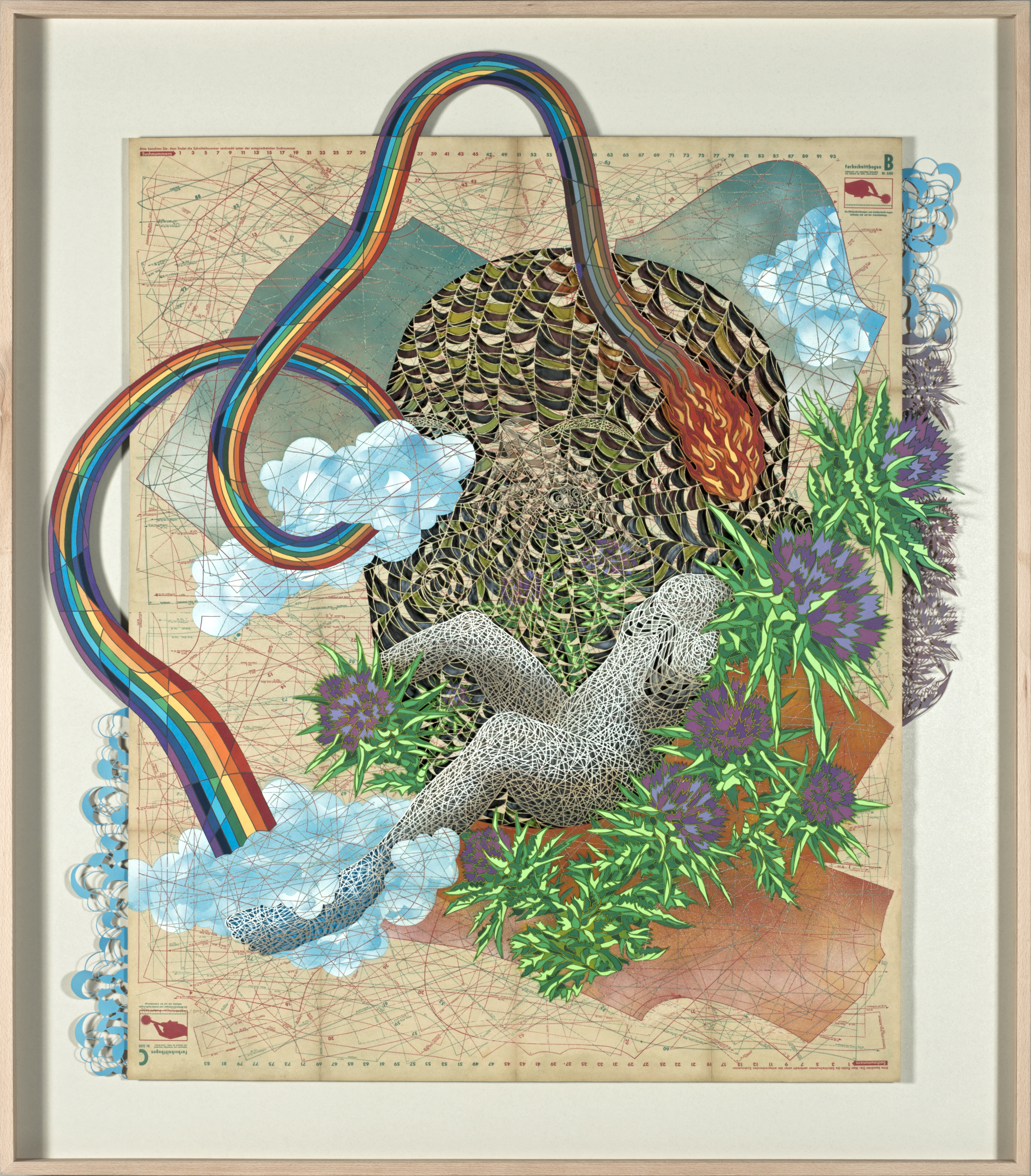 Tatsız rüyalar, sanatçının üç defterinde devam ediyor. Serkan Yüksel’in on senelik bir defter tutma geçmişi var ve ilk kez deftelerini paylaşmaya karar veriyor. Defterler 1950’lerden beri kullanılan bir katmanlama sistemi ile kesilmişler. 2017, 2020 ve 2023 yıllarında yapılan defterlerin ikisini pandemiden hemen sonra görüp hayran olmuştum. Acayip bir el emeği olan defteler bir pandemi ürünü çünkü… Sokaklarda boşluklar, aç kalıp ölen hayvanlar ruhumuzdaki oyuklar gibi oyulmuşlar; bir bağ kurma çabasına dönmüşler. Sokaklardan ülkeye açıldığımızda Akbelen’de Kaz Dağları’nda yaşanan felaketler, tahrip, göz yumma, doldurulamayan oyuklara dönüşmüş. Topografik haritaların çizimlerinden referansla kesilen defterler, bereketli toprakları sürekli kazılmasına, eşelenmesine bir gönderme.