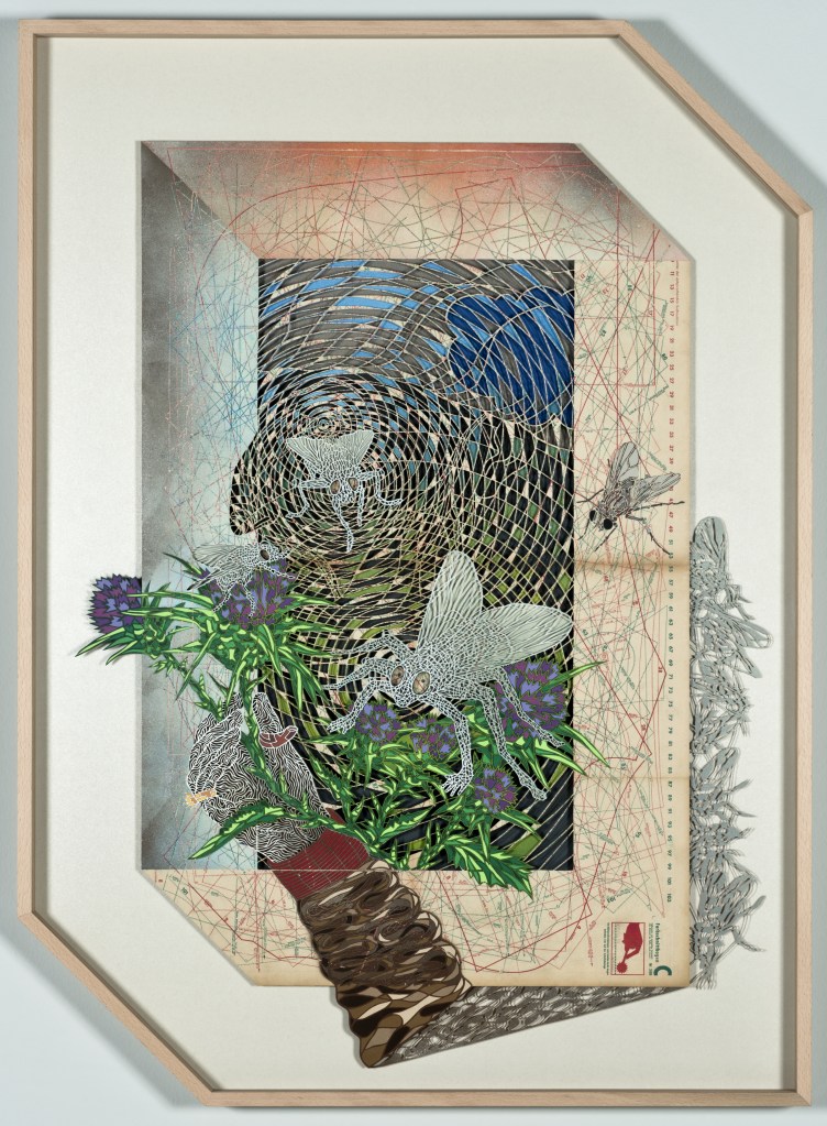 Serkan Yüksel’in x-ist’te devam eden “İlerleme-Gerileme” sergisi boyunca sinekler, peygamber devesi, deve dikenleri, gökkuşakları, hikayelerini birbirine bağlanan (cut out) kesilerek yapılmış resimlerde önümüze çıkıp duruyorlar. En beğendiğim eserlerden “Burun Ucu”, hem daha önce kadınların yüzüne sineklerin konduğu resimlerinin bir devamı, hem de bu serginin bir özeti gibi… İstanbul Sözleşmesi feshi ile beraber kadınların üzerine konan sineklerden korunmaya çalışıyor kadınlar doğada sinek kapanı görevi gören peygamber devesi kolları ile. Artık belli bir kesim gördüğünde kendilerinde anlamından bağımsız bile rahatsızlık yaratan gökkuşağı, bir şimşeğe dönüşmüş. Bu resim, sergideki heykellerden biriyle bir dayanışma halinde: Yüksel’in kızına itafen yaptığı, dev peygamber devesi kolları olan, çocuk kıyafetleri giymiş bir heykel ile… Serkan Yüksel senelerdir annesinin kullandığı, çocukluğundan hatırladığı paftaları keserek resimler yapıyordu; ilk kez paftayı gerçek kullanımına uygun olarak değerlendirip bir çocuk kıyafeti yapmış. Bunu yaparken bütün huzursuzluğa rağmen biraz da eğlenmek istemiş; ünlü dizi Wednesday’deki karakter gibi düşünün bu çocuğu diyor, biraz sert, biraz ters, pabuç bırakmayacak, kendini koruyabilen bir çocuk bu… Toplumda bir uyumsuzluk var, diyor sanatçı. Birileri çocuklarını anlayışlı, hakkaniyetli yetiştirmeye çalışırken bir kesim tam tersini yapıyor. Ne kadar zararlı olursa olsun, eşitliği bozarsa bozsun, bir şekilde bir çıkarı varsa herhangi bir fikre üşüşülüyor. Hakkaniyeti sinekler kaplıyor…