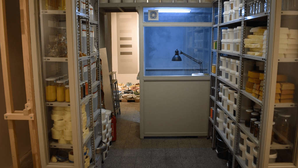 Osepyan’ın yine sergiyi iyi temsil ettiğini düşündüğü işlerden biri, açıkçası anlayana kadar biraz zorlandığım, Yağız Özgen’in “Boyacı” eseri. Eser, dil ile oynarak aklımızdaki aynı anlamlara gelen değişik kavramları sorguluyor. “Boyacı”nın TDK’da bile üç anlamı var: Boyama işini, boyacılığı meslek edinen kimse; boya yapan veya satan kimse; boya satılan dükkan. Özgen, boyacı kavramından resim ve ressamlara uzanıyor. Ressam resme, resim de farklı kimyasalların ve fırçaların kudretlerine bağımlı; bunları hepsi ise boyacıya bağlı. Ressamların yüzyıllardır süregelen otoritesini sorgulayan sanatçı, ressamı tanrı katından indirip boyacıya bağlı kılıyor ve izleyiciyi sanat sisteminin temel unsurlarını yeniden düşünmeye davet ediyor.