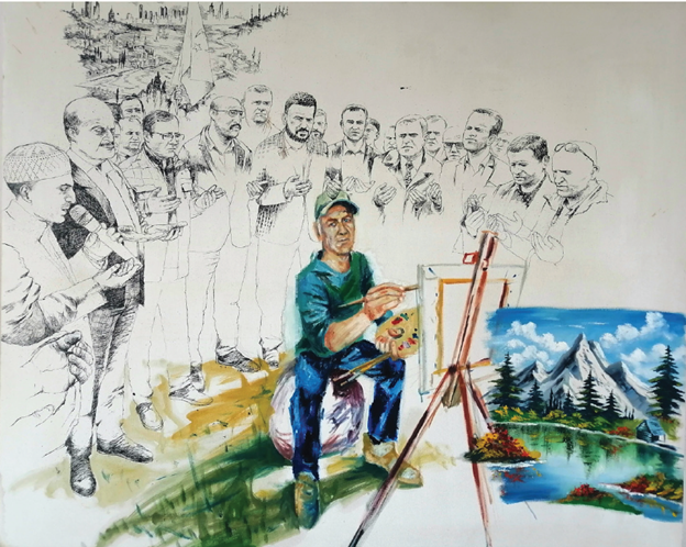 Sanatçı ne kadar köklere dönmek ya da kendi dünyasında kalmak isterse istesin, entelektüel birikimiyle hayat ve toplumla ilgili kafa yorup fikir üretmek isterse istesin, onu çevreleyen dış dünya bambaşka. Aslında bu hepimiz için geçerli. Ne yaparsak, ne düşünürsek düşünelim, içinde yaşadığımız başka bir gerçeklik var. Burhan Kum’un bunu çok iyi yansıtan resimlerinden biri olan Resmi Dilek (Temenni) resmi, bu sebepten sergide en sevdiğim resimlerden biri oldu. Kum, bir gün gazetede kebapçı açılışında dua eden bir topluluğun olduğu bir fotoğraf görmüş. Her şey Allah’a kalmış, diyor sanatçı. Biz burada resim yaparak hayatta kalmaya çalışıyoruz, sanatçı olarak bir valık mücadelesi veriyoruz, elalem orada kebapçı açılışında bile Allah’tan medet umar durumda. Mücadele yok, Allah var. O yüzden, kendini sanatçı olarak ortada konumlandırdığı, bu arada toplumun klişe sever anlayışına uygun karlı dağlar resmettiği, çevresinde de kebapçı dua güruhunun bu kez kendisi için dua ettiği bir resim yapmış. Belki Allah yardım eder… Bu resimde, sergideki tüm resimlerde yer alan sevdiğim bir detay olarak, sanatçı, “bizim yaşadığımız” dünyayı renkli, diğerlerinin dünyasını ise renksiz resmetmiş.