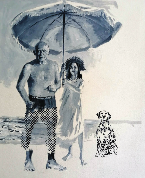 Kum’un resmettiği bir başka özellikle bahsettiği ve resmettiği isim de Picasso. Sergideki resimlerinden birinde Picasso’yu bir kumsalda yürürken görüyoruz. Picasso ile kendisini güneşten koruyan şemsiyeyi Picasso’nun berbat davrandığı sevgilisi kendisi de ressam olan fakat resimlerini sergilemesi için Picasso’nun izin vermediği Françoise Gilot tutuyor. Resimdeki köpeği ise Burhan Kum, Picasso’nun kadınlara köpek gibi davranmasına gönderme olarak eklemiş.