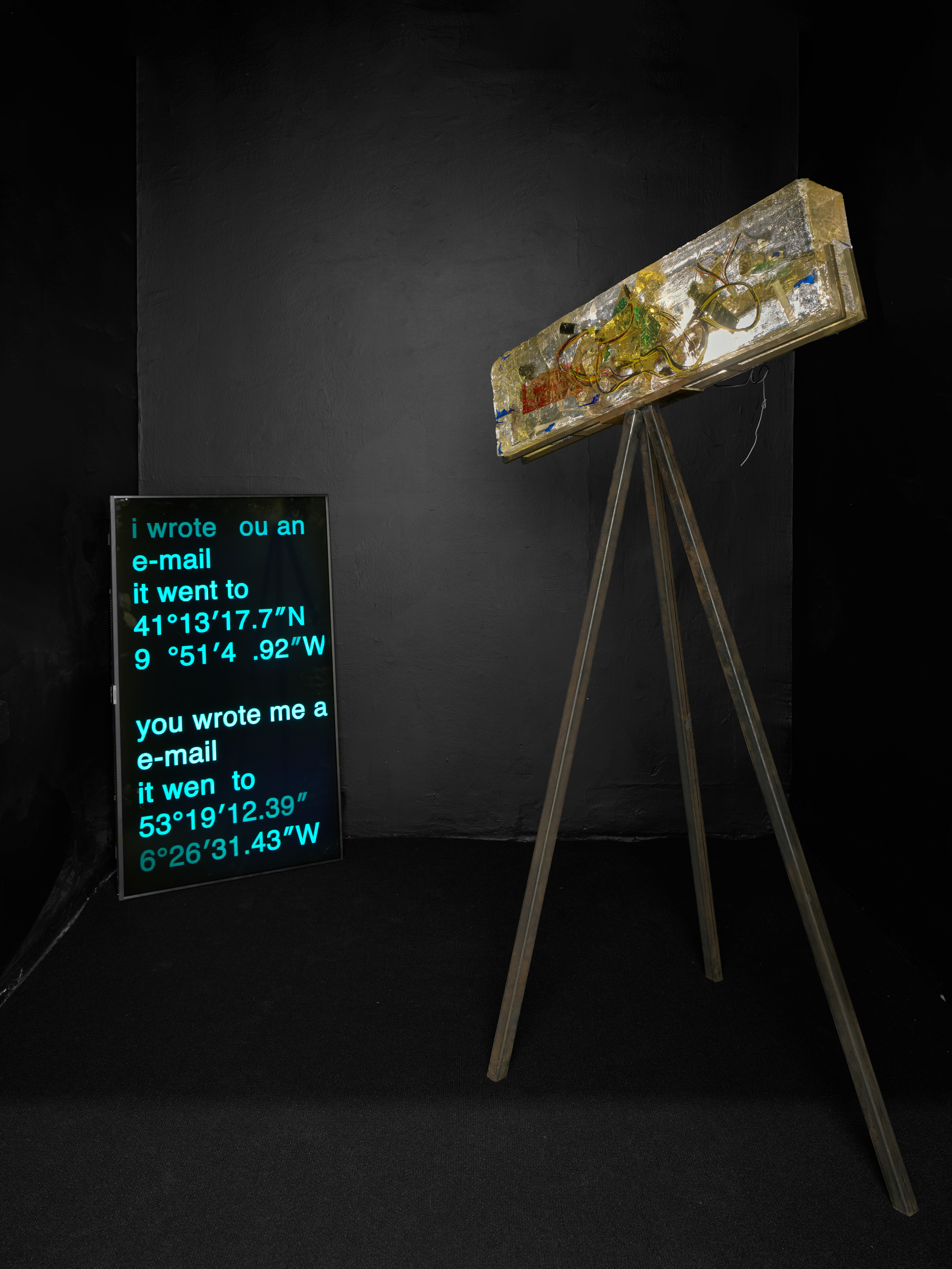 Sergideki bir diğer favorim ise, sergiye başka bir bakış açısı, ferahlık ve eğlence katan Yelta Köm’ün yerleştirmeleri oldu. Uygulamalardan konuştuğumuz insanlar için, daha da kötüsü bu uygulamaların sahipleri için koordinatlarımız artık açık ve net. Hepimiz “big data”nın bir parçasıyız. O dev arşivde küçücük ama istenirse cımbızla çekilip çıkarılacak rakamlarız. Yok öyle ICQ’de, MIRC’de takma isimle takılmak… Diğer yandan da insan ilişkileri giderek bu dijital networklere kaydığı için tanımadığımız insanlarla kontrolümüz olmayan dev bir dijital dünyada buluşuyoruz. Eserin söylediği gibi “Haritada olmayan yerlerde buluşuyoruz.”